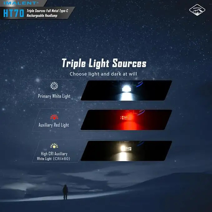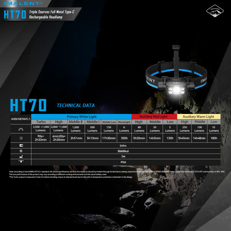چراغ پیشانی HT70 MHF ایمالنت دارای 5 عدد لامپ با نور زرد نچرال، سفید مرکزی و نور قرمز است که قدرت روشنایی چراغ اصلی چراغ پیشانی ایمالنت HT70 MHF در حالت حداکثری 3500 لومن است که برد نور نهایی 349 متری با پخش نور گسترده با مدت زمان نوردهی 2 ساعت و 33 دقیقه در اختیار کاربر قرار میدهد.