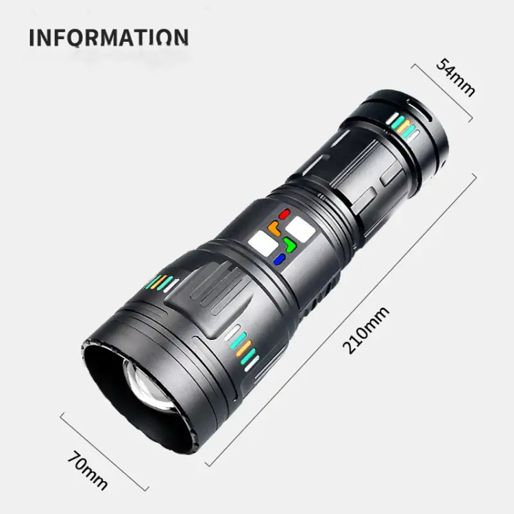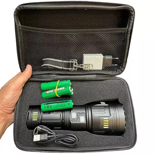 چراغ قوه، بند حمل دوشی، 4 عدد باتری 2200 میلی امپر،شارژر و کابل شارژ تایپ سی، هارد کیس فلزی