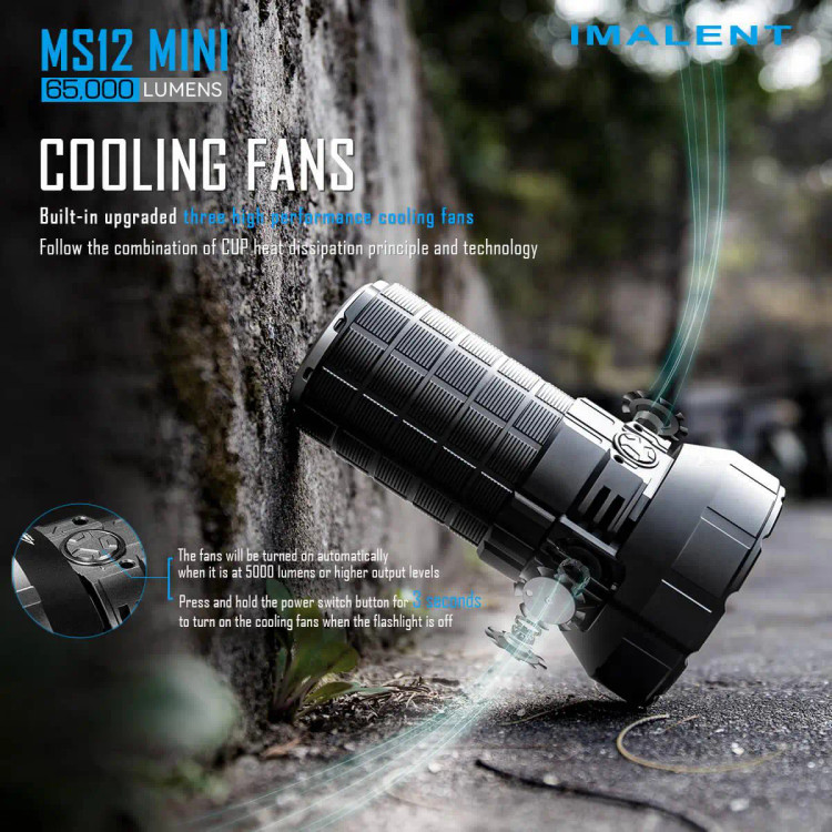 چراغ قوه IMALENT MS12 MINI با حداکثر روشنایی ۶۵,۰۰۰ لومِن، یکی از قویترین و جمعوجورترین چراغهای دستی موجود در بازار است. این مدل از ۱۲ چراغ LED آمریکایی CREE XHP70 بهره میبرد که عمر مفید آنها تا ۵۰,۰۰۰ ساعت میرسد. طراحی خاص و فناوری پیشرفته IMALENT، ترکیبی از نور متمرکز و گسترده را برای فعالیتهای شبانه و ورزشهای بیرونی فراهم میکند.
