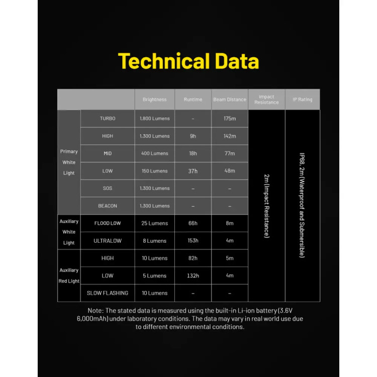 باتری قدرتمند ۶۰۰۰ میلیآمپری این چراغ پیشانی، تا ۳۷ ساعت در حالت نور کم و تا ۱۸ ساعت در حالت ۴۰۰ لومن دوام دارد.