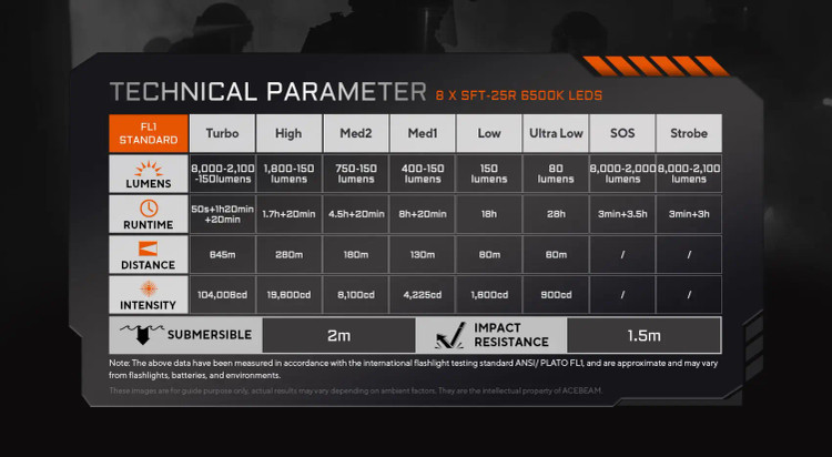 حالت نور روشنایی (Lumens) مدتزمان (Runtime) برد نور (Distance) شدت نور (Intensity) Turbo 8,000 → 2,100 → 150 lm 50s + 1h20min + 20min 645 m 104,000 cd High 1,800 → 150 lm 1.7 h + 20 min 280 m 19,600 cd Med 2 750 → 150 lm 4.5 h + 20 min 180 m 8,100 cd Med 1 400 → 150 lm 8 h + 20 min 130 m 4,225 cd Low 150 lm 18 h 80 m 1,600 cd Ultra Low 80 lm 28 h 60 m 900 cd SOS 8,000 → 2,000 lm 3 min + 3.5 h — — Strobe 8,000 → 2,100 lm 3 min + 3 h — —