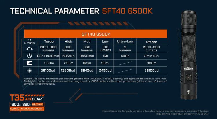 ACEBEAM T35 از یک عدد باتری 18650 استفاده میکند و در بستهبندی آن یک باتری 2600 میلیآمپرساعتی قرار داده شده است.