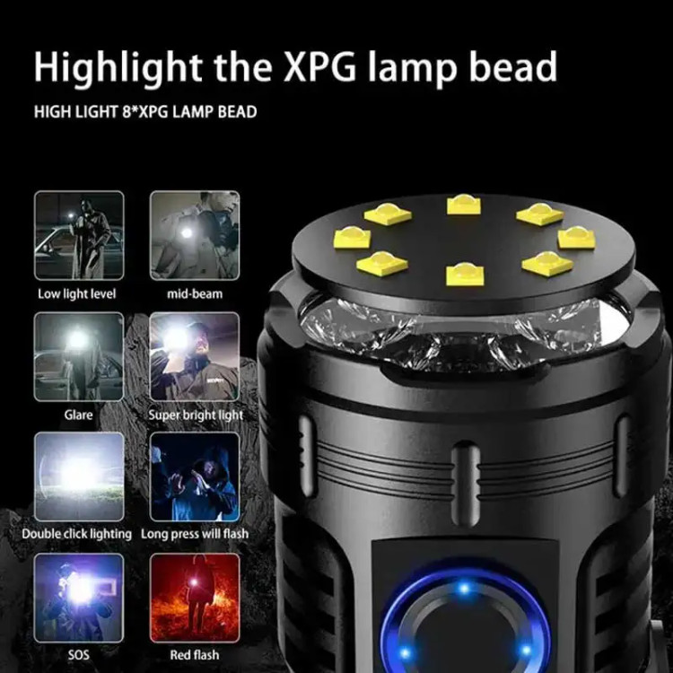 این چراغ قوه دارای 8 لامپ قوی XPG با توان 40 وات می باشد که با داشتن 5 حالت نوردهی اصلی و 3 حالت جشمک زن که شامل حالت نوردهی ضعیف، متوسط، قوی و توربو است و حالت چشمک زن آن با فشردن دکمه پاور به مدت 3 ثانیه فعال شده و دارای دو حالت چشمک زن و دو رنگ سفید و قرمز نیز می باشد.